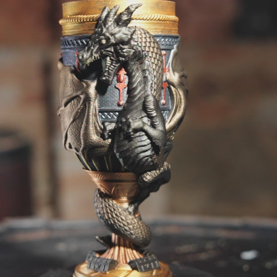 A powerful black dragon coils around the goblet, its scales, wings, and fierce expression brought to life with high-resolution 3D printing. The base and rim are accented in metallic gold-bronze tones, adding an air of regal craftsmanship. Crimson runic embellishments across the goblet’s surface further evoke a mystical, ancient aesthetic.