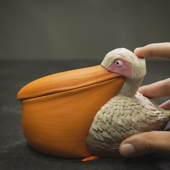 This charming 3D printed Pelican Trinket Eater is equal parts whimsical decor and functional storage. Designed to mimic a pelican mid-gulp, its exaggerated orange beak swings wide open to reveal a surprisingly spacious bowl perfect for holding coins, keys, candy, jewelry, or any other small treasures you need tucked away in style.