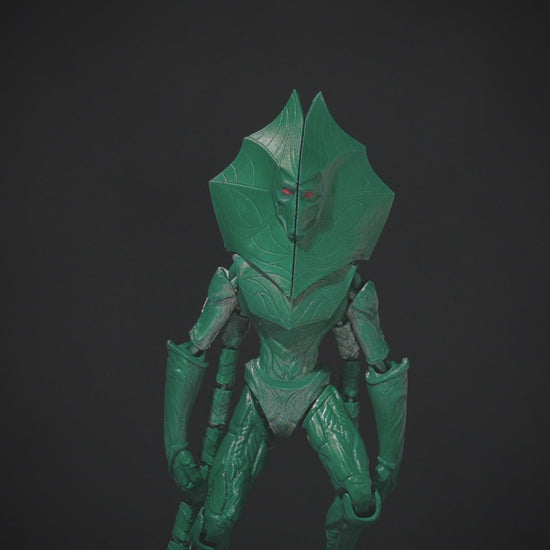 The outer mech boasts intricate surface textures and bold, leaf-like armor panels, giving it a powerful alien insectoid aesthetic. Hinged limbs allow for dramatic stances, while the cockpit opens to reveal the adorable (but clearly in charge) translucent green Arquillian alien inside.
