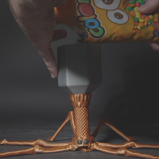 Inject some science-inspired fun into your space with this 3D Printed Articulated Bacteriophage Candy Dispenser! Modeled after a bacteriophage virus with a whimsical twist, this unique creation features a segmented orange body with flexible legs and a textured neck, topped with a sleek, geometric candy storage capsule.
