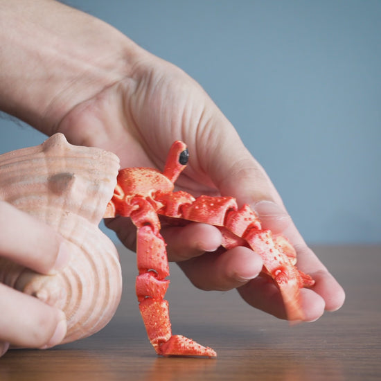 Meet Hermes, the 3D printed articulated hermit crab with a whole lot of personality! This charming crustacean features a detailed spiral shell and segmented red limbs that move with lifelike flexibility. His expressive eye stalks peek playfully from under his shell, giving him a curious and whimsical look that's perfect for display, fidgeting, or gifting.