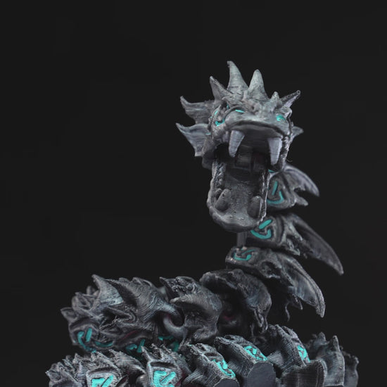 Summoned from the depths of Norse myth, The Midgard Serpent slithers into reality with ominous grace. This 3D printed masterpiece features an intricately scaled, multi-segmented body with full articulation, allowing it to coil, stretch, and strike with lifelike motion. Hand-painted in stone-textured grays with striking ethereal blue runes, its glowing eyes and fierce fangs capture the ancient terror of Jörmungandr itself.