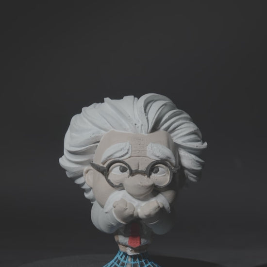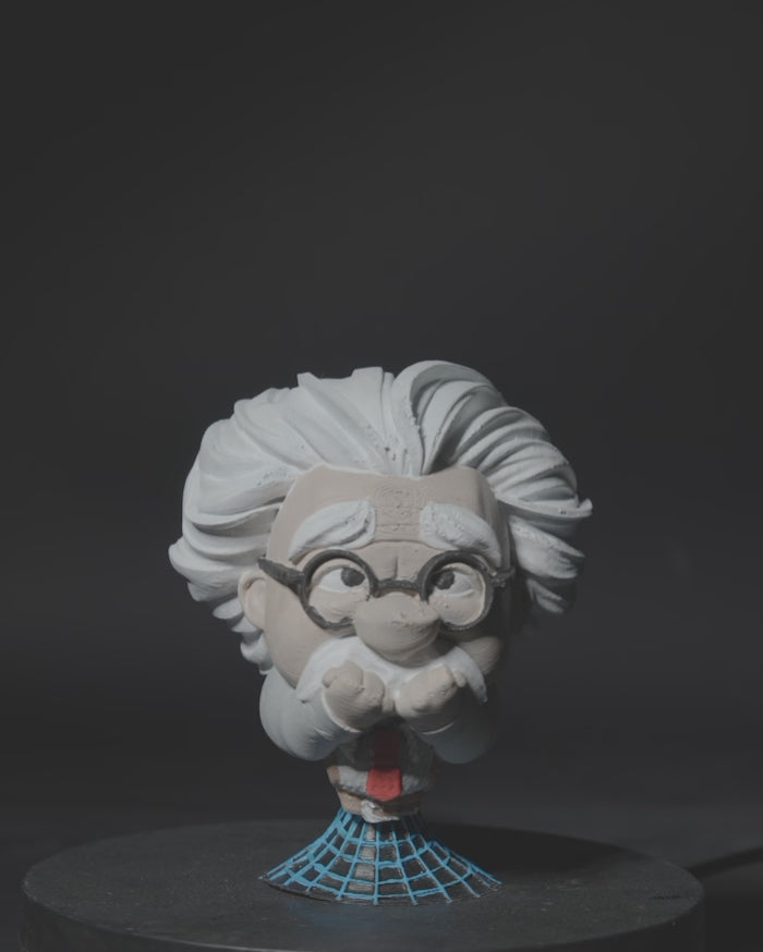 Every statue is meticulously 3D printed with bold character details: wild white hair, expressive brows, bushy mustache, signature red tie, and classic round spectacles. They stand atop a stylized blue wireframe base that adds a futuristic, science-lab flair to their otherwise vintage cartoon charm.