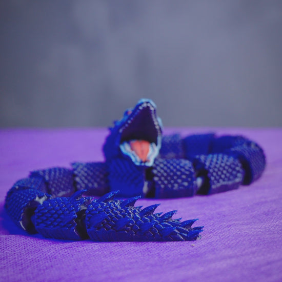 Unleash the mythical menace of the Wraparound Basilisk, a fully articulated 3D printed serpent creature designed to coil with eerie elegance. Featuring razor-sharp detailing from its spiked tail to its open-mouthed, red-eyed snarl, this creature oozes danger and mystique. Its segmented body allows it to wrap and pose fluidly around objects, shelves, or displays—perfect for fantasy decor, tabletop settings, or collectors of the arcane. Printed in a shimmering midnight blue with fiery red accents, this basilisk is both a visual stunner and a fearsome guardian.
